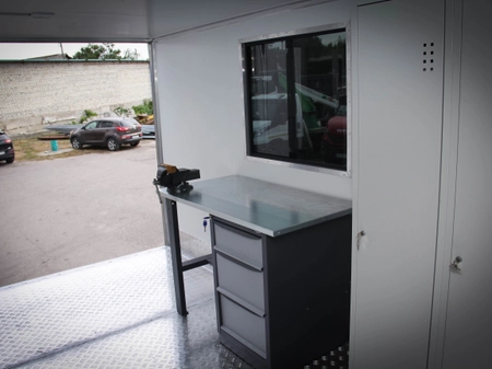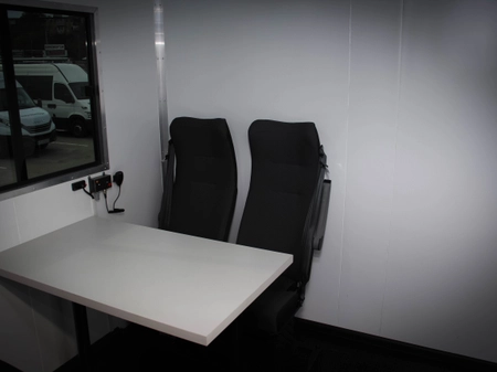 облаштований двома автомобільними тонованими вікнами (глухе в бокових дверях та розсувне напроти) + стаціонарний стіл, з переговорним пристроєм;